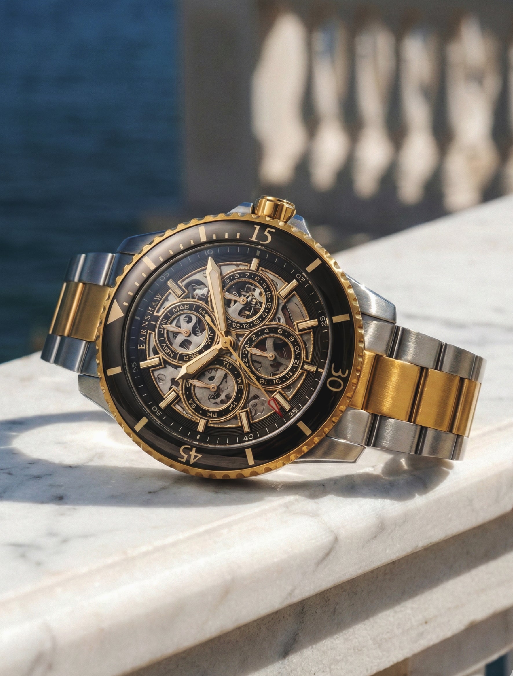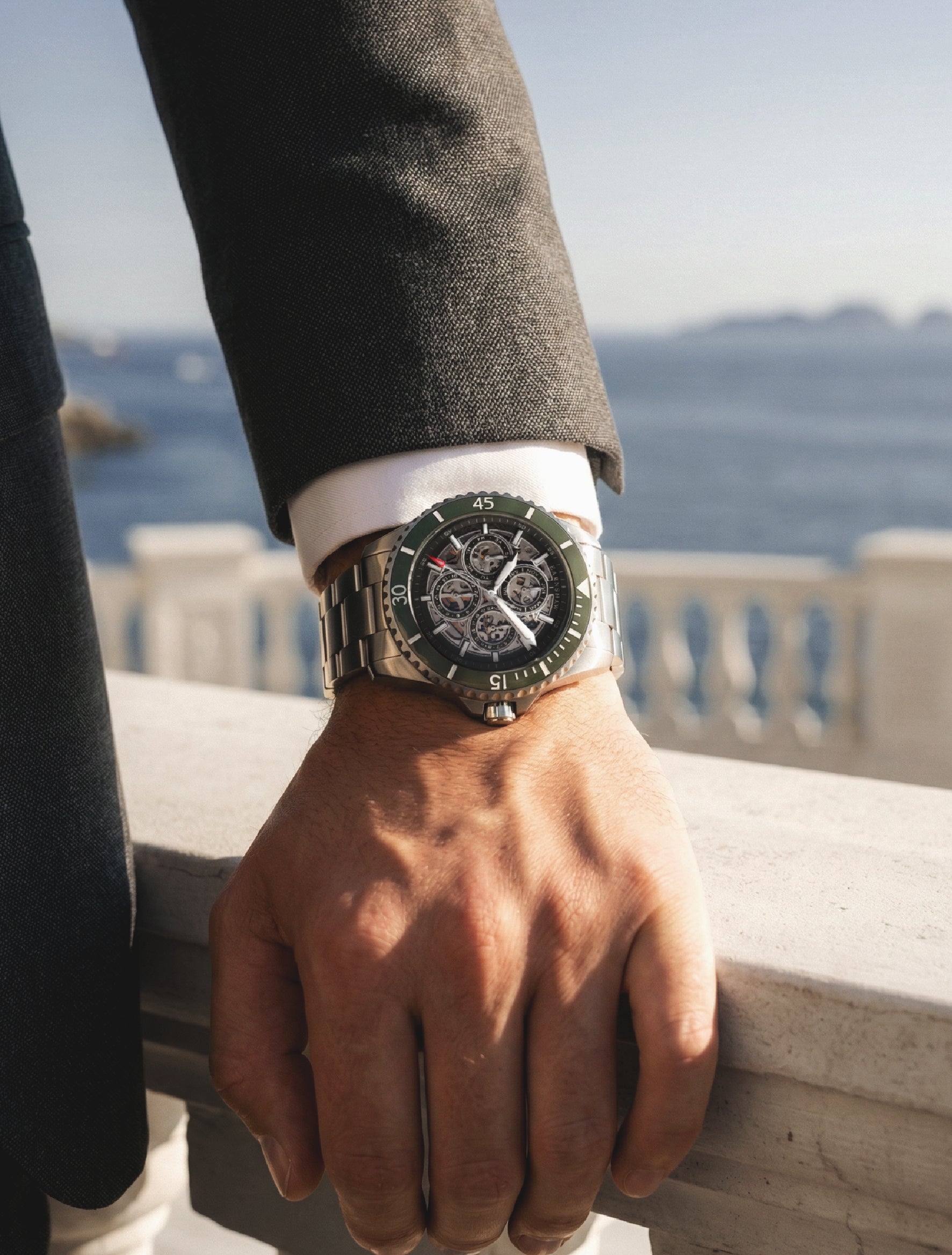 With its distinctive tonneau case and innovative open-worked construction, this timepiece offers a captivating view of its intricate mechanical movement.