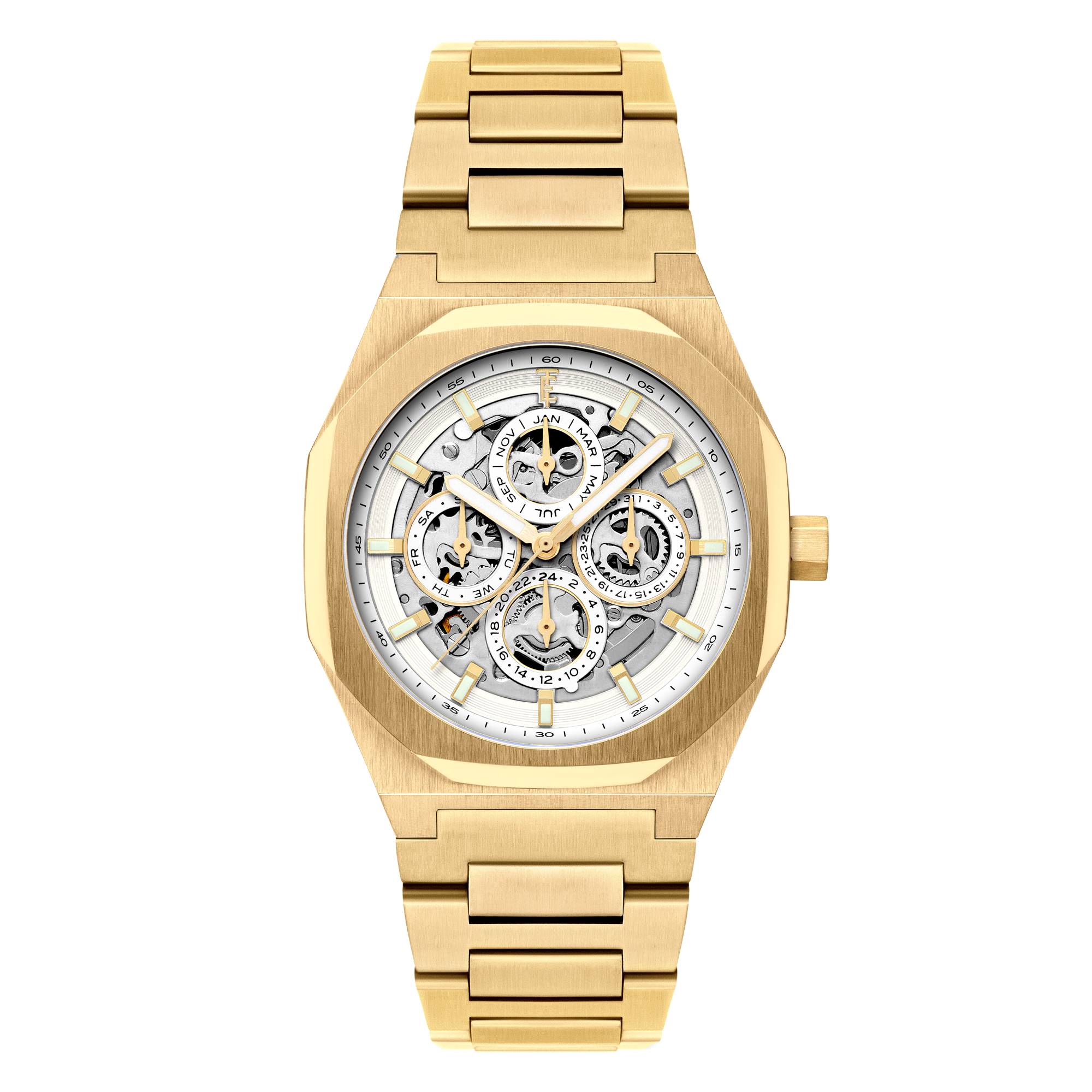 Quick viewCloudy Gold €341,95 EUR /Triple Calendar Skeleton AutomaticNewAutomatic Skeleton With Multi-function42.0mm Stainless Steel Case26mm Gold Stainless Steel With Butterfly Clasp With Push Button -