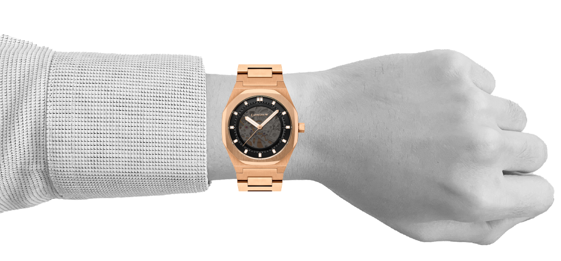 Stylish and sophisticated, the Drake displays the inner workings of its self-powered, skeleton Automatic movement through the dial. A full expression of centuries of watchmaking.