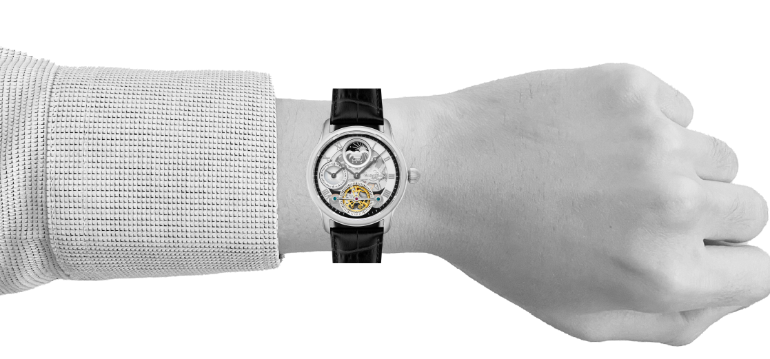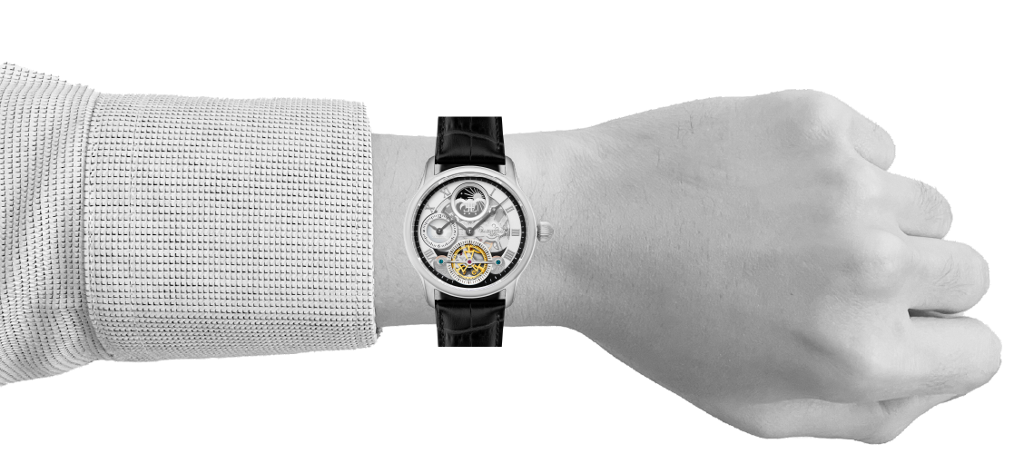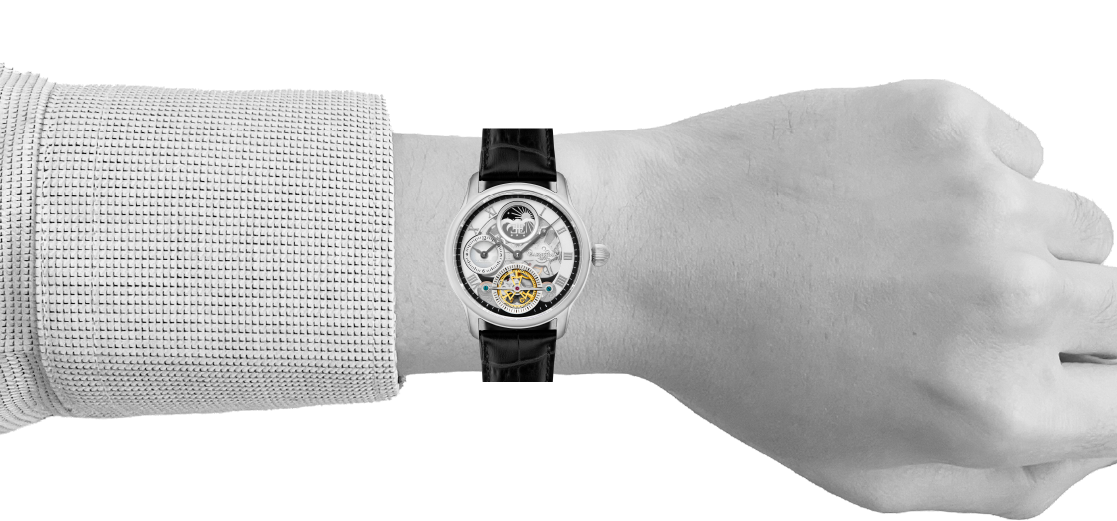 Drawing inspiration from the lines of Longitude, once the most crucial tool in navigating the seas, a large, classically formed case exhibits a complex yet precise piece of timekeeping mastery.