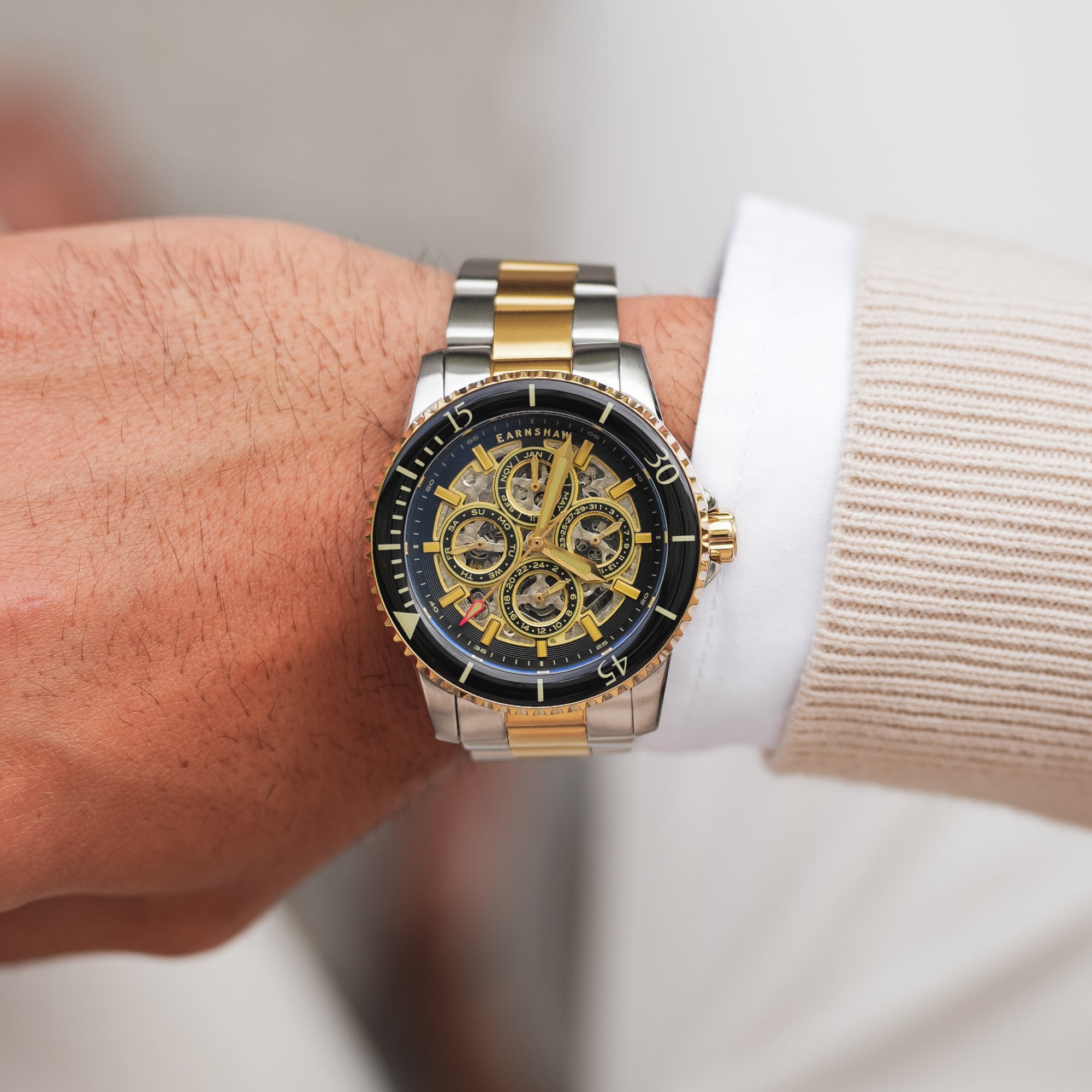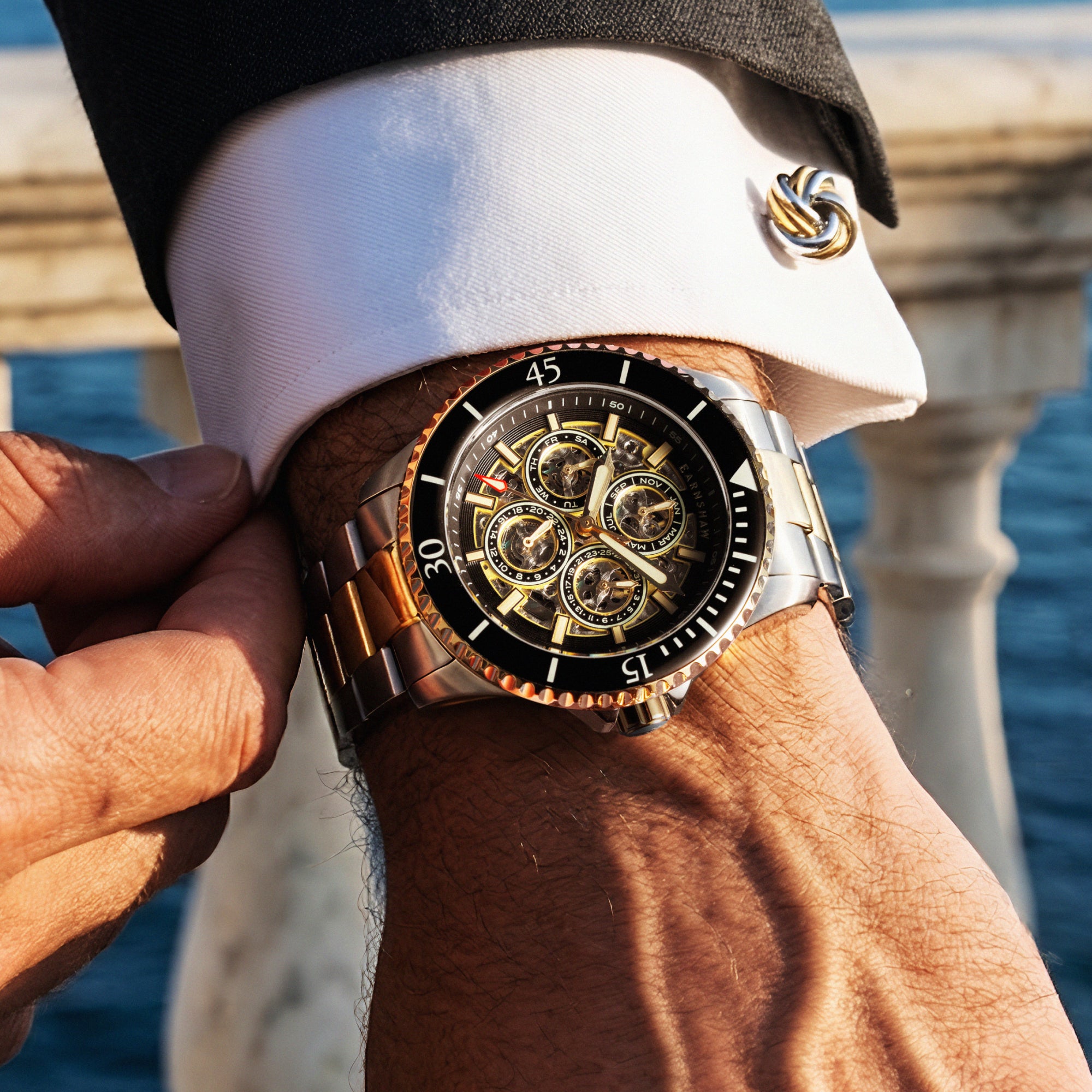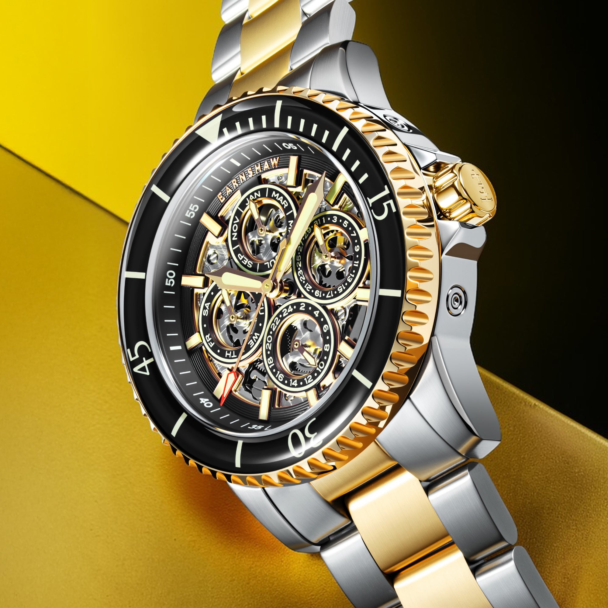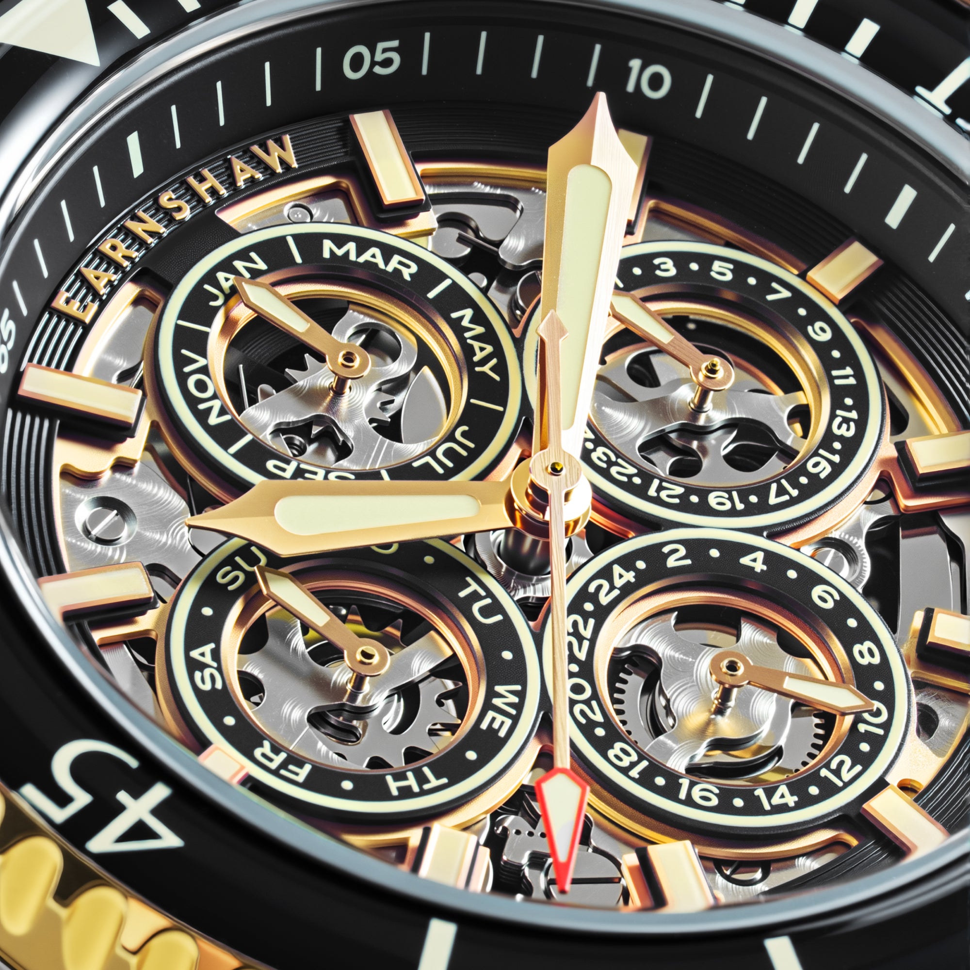 The Admiral Duncan is a masterstroke of clarity, character, and commanding style. This distinguished timepiece boasts a self-winding skeleton movement, with a clear display of the hour, day, date, and month.