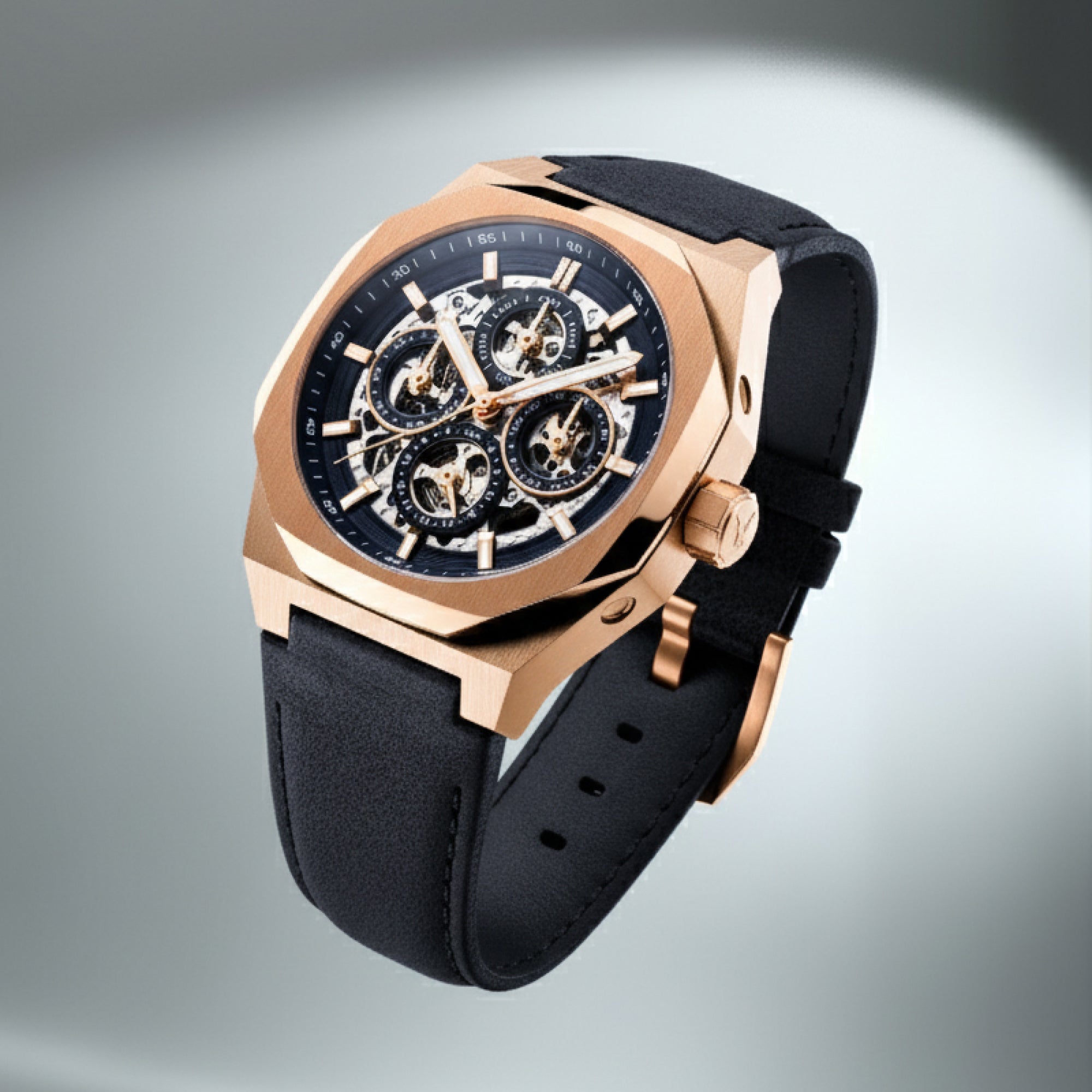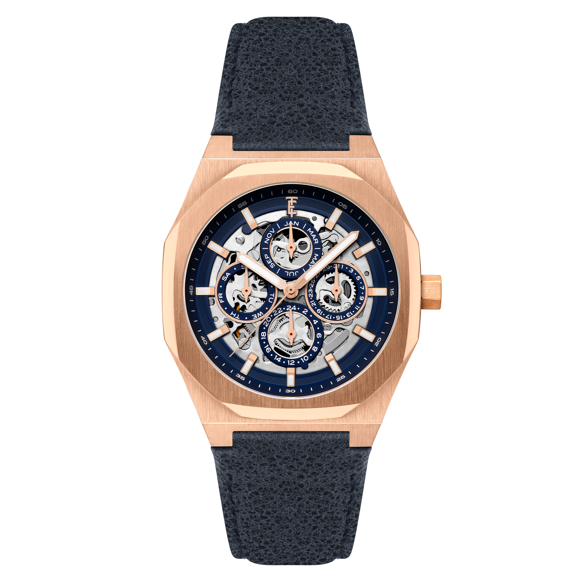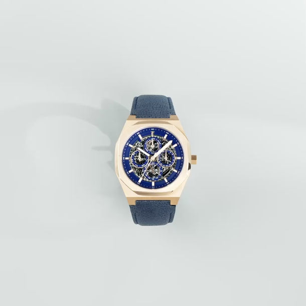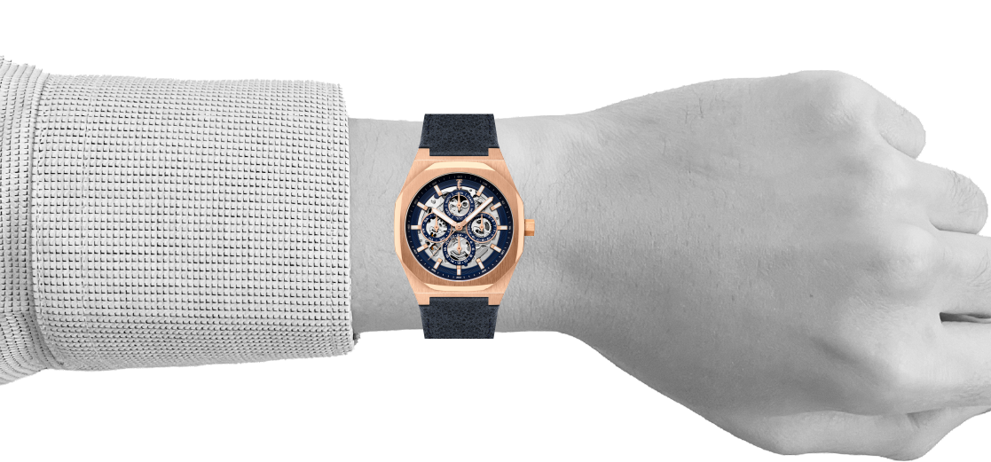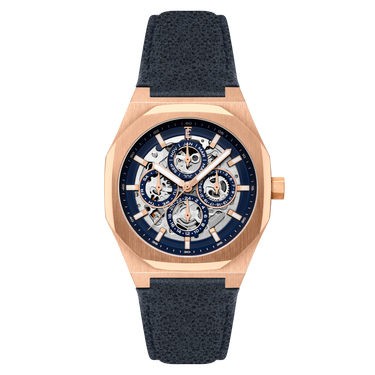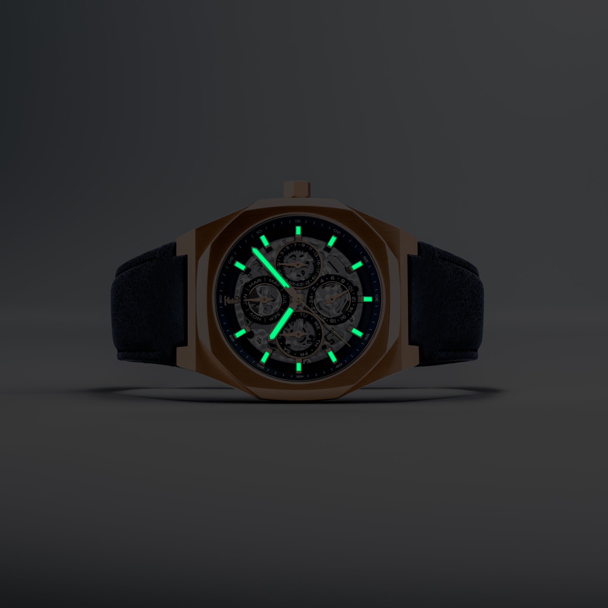 The Drake returns, now reimagined with enhanced complications. At its core, the automatic movement offers a clear display of time, day, date, and month—all at a glance. The skeletonized dial unveils the mechanical artistry within, showcasing the captivating rhythm of its inner workings. Encased in a 42mm polished stainless steel case, the Drake is designed to complement your journeys ahead.
