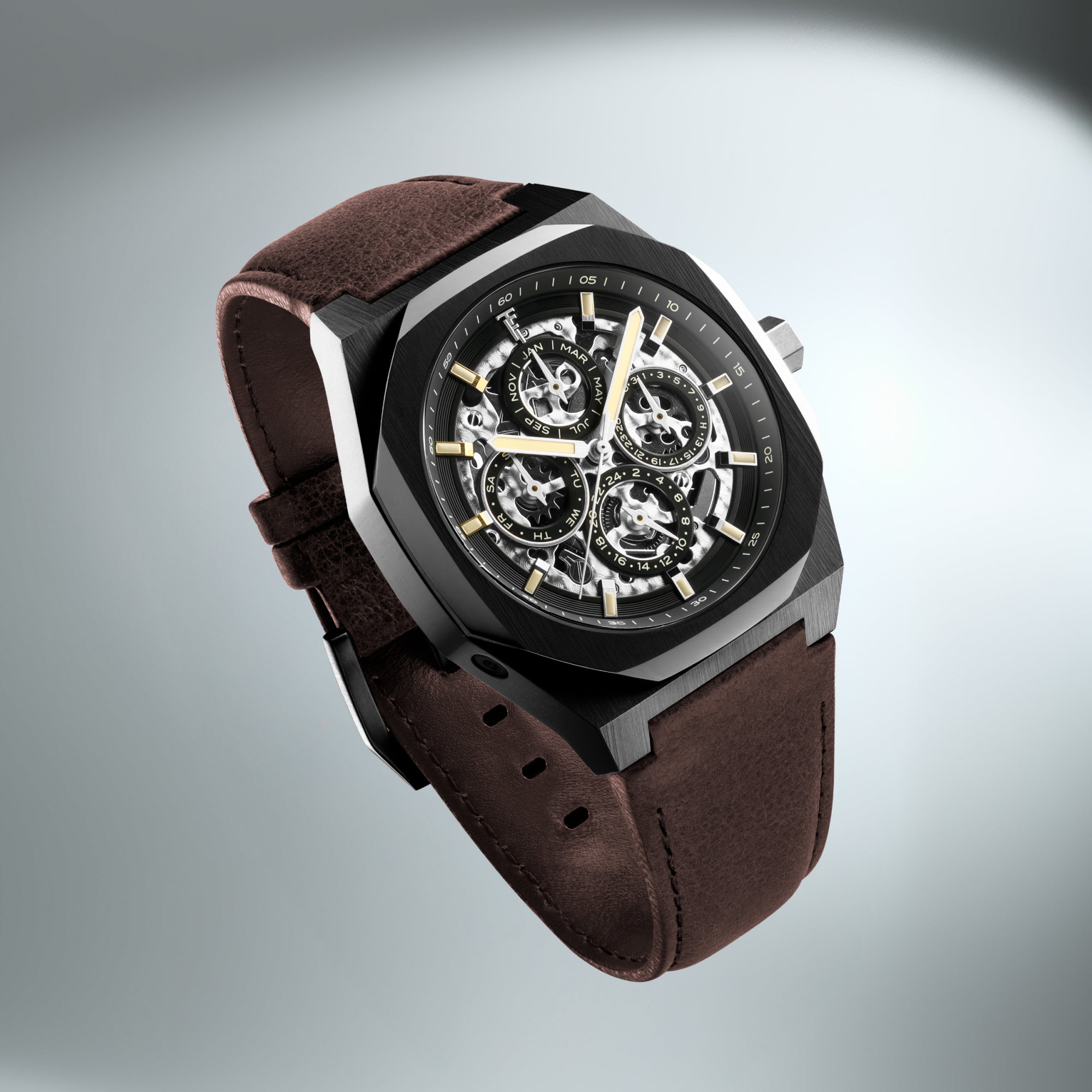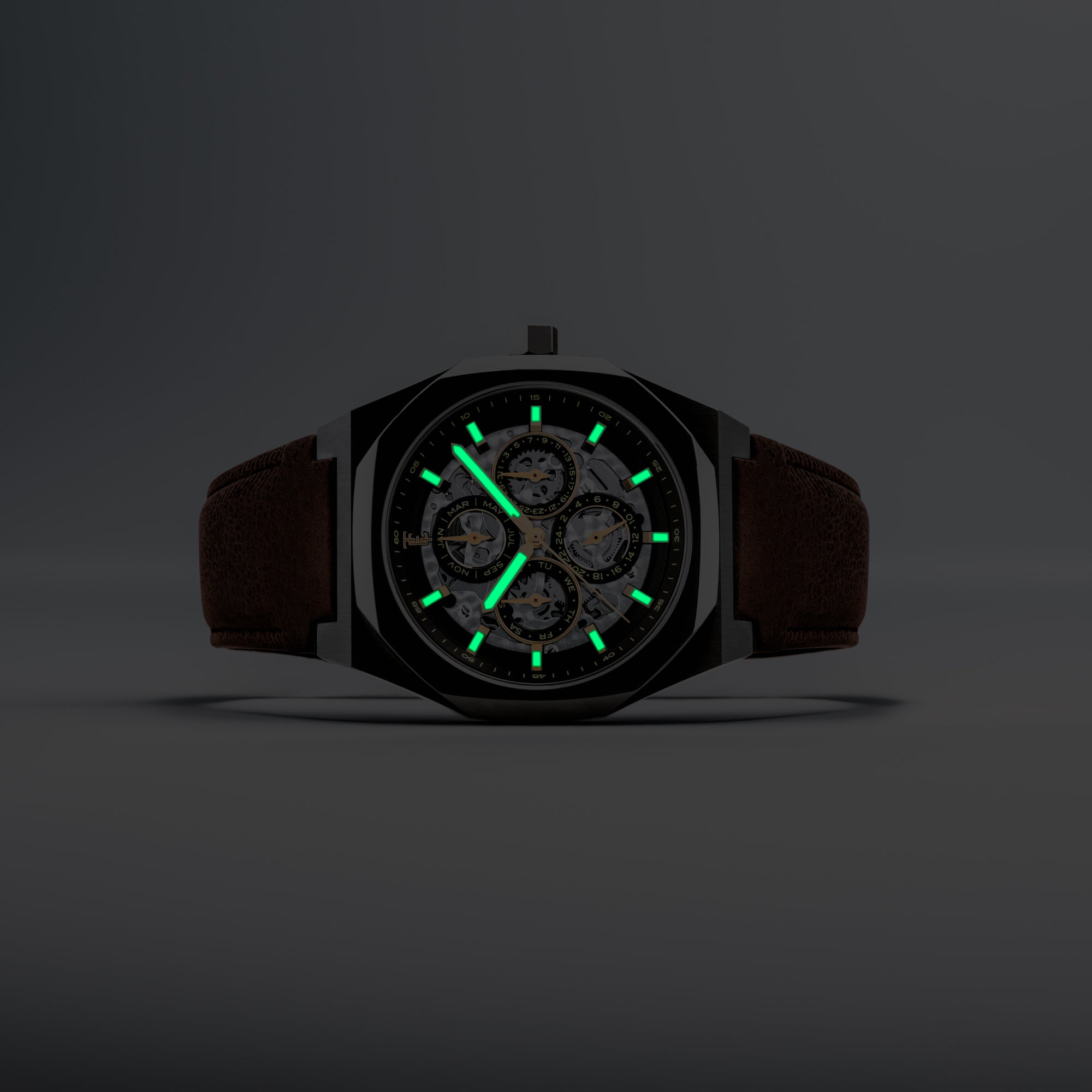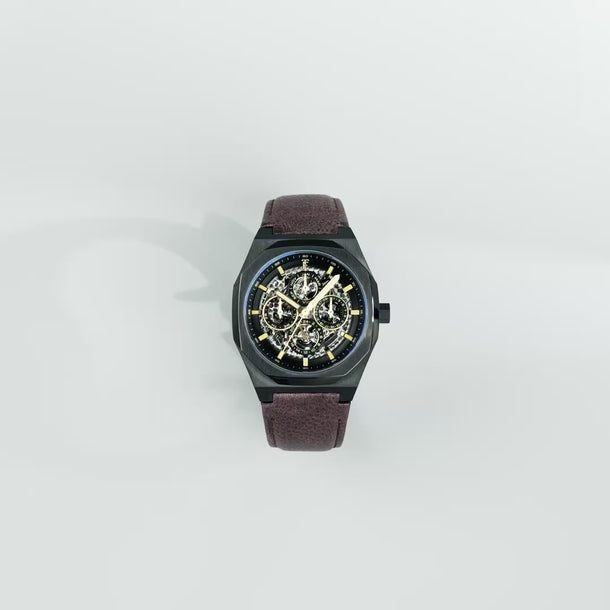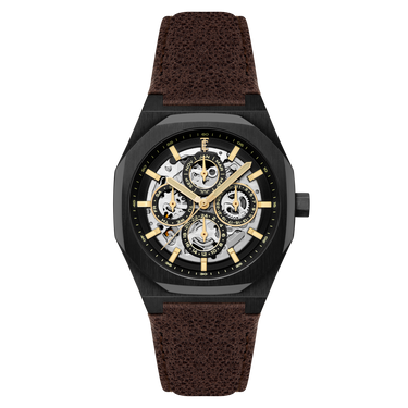 The Drake returns, now reimagined with enhanced complications. At its core, the automatic movement offers a clear display of time, day, date, and month—all at a glance. The skeletonized dial unveils the mechanical artistry within, showcasing the captivating rhythm of its inner workings. Encased in a 42mm polished stainless steel case, the Drake is designed to complement your journeys ahead.