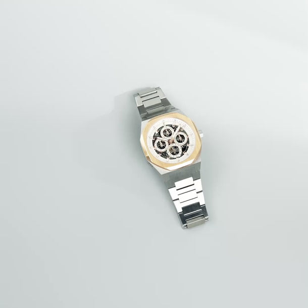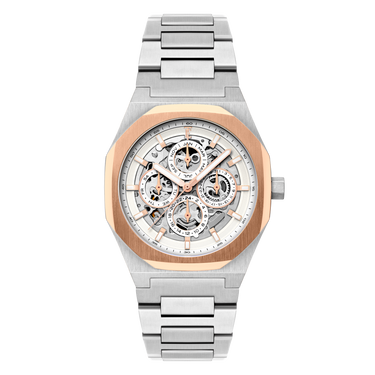 The Drake returns, now reimagined with enhanced complications. At its core, the automatic movement offers a clear display of time, day, date, and month—all at a glance. The skeletonized dial unveils the mechanical artistry within, showcasing the captivating rhythm of its inner workings. Encased in a 42mm polished stainless steel case, the Drake is designed to complement your journeys ahead.