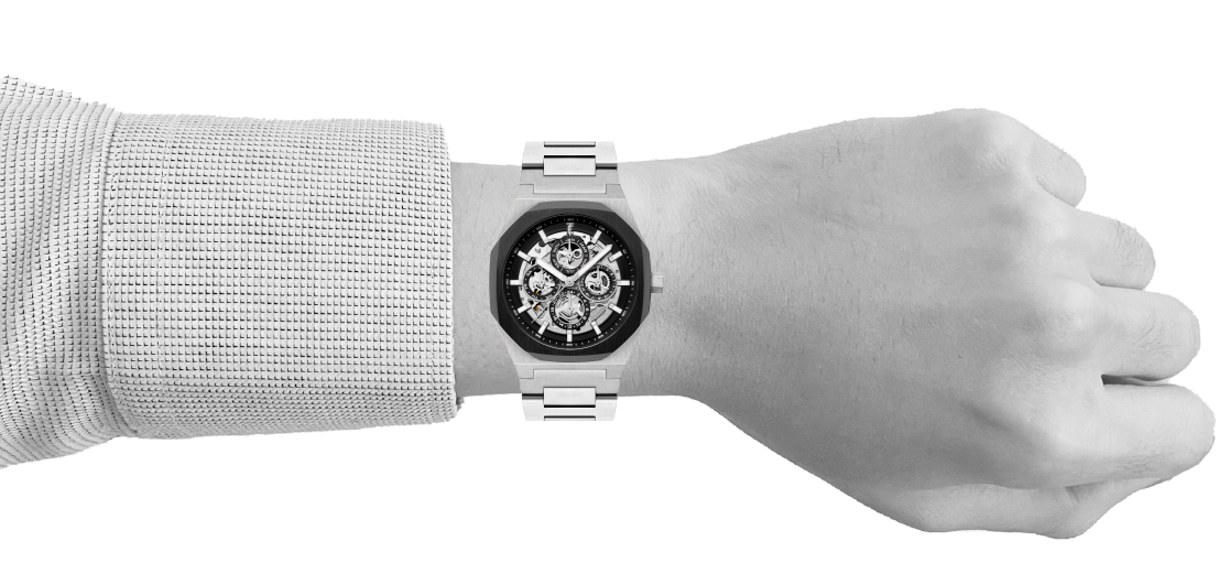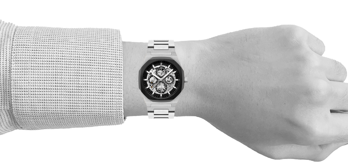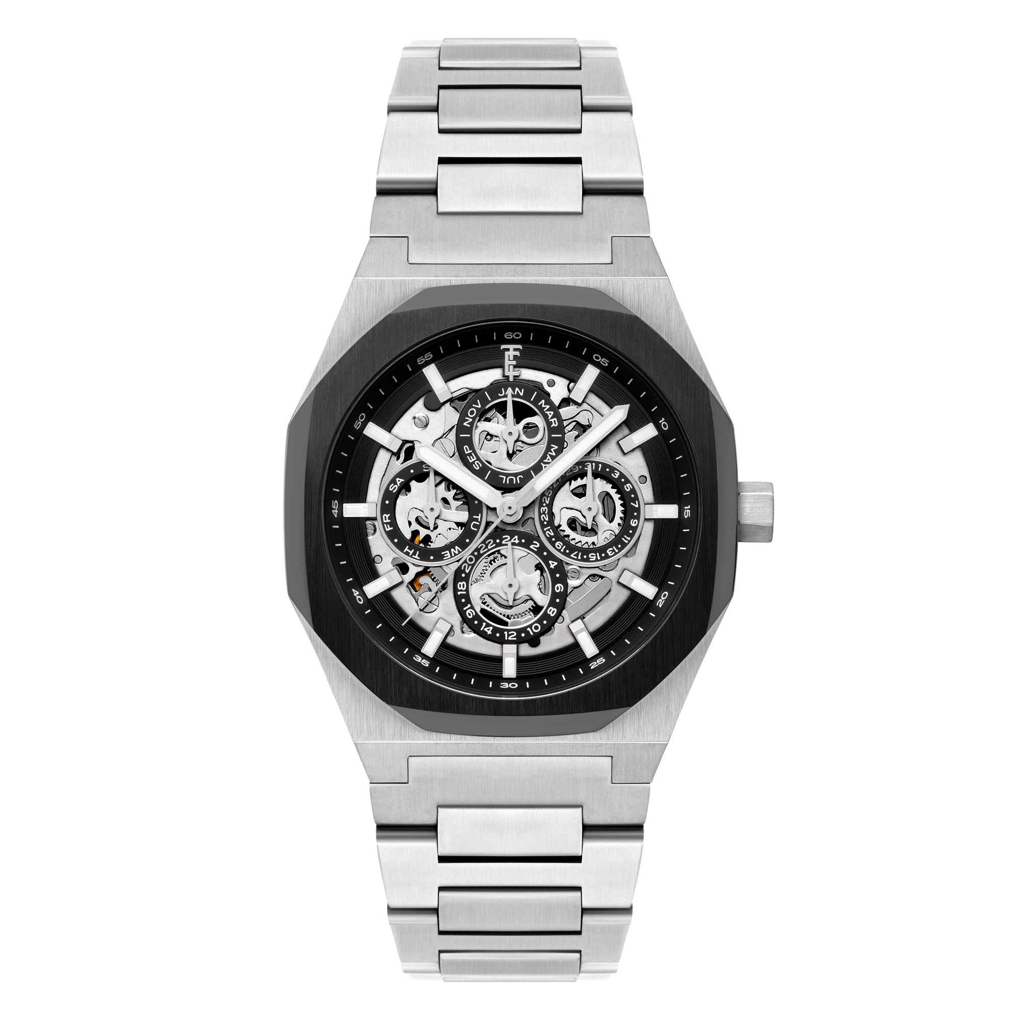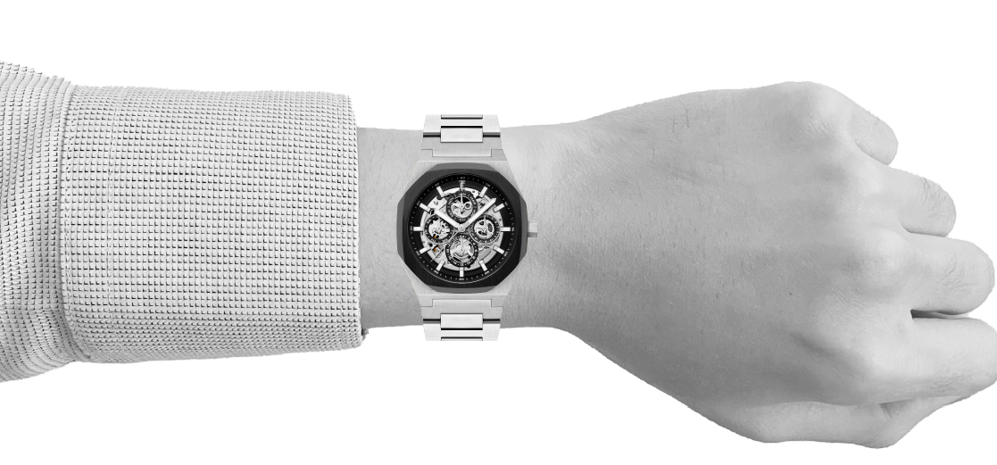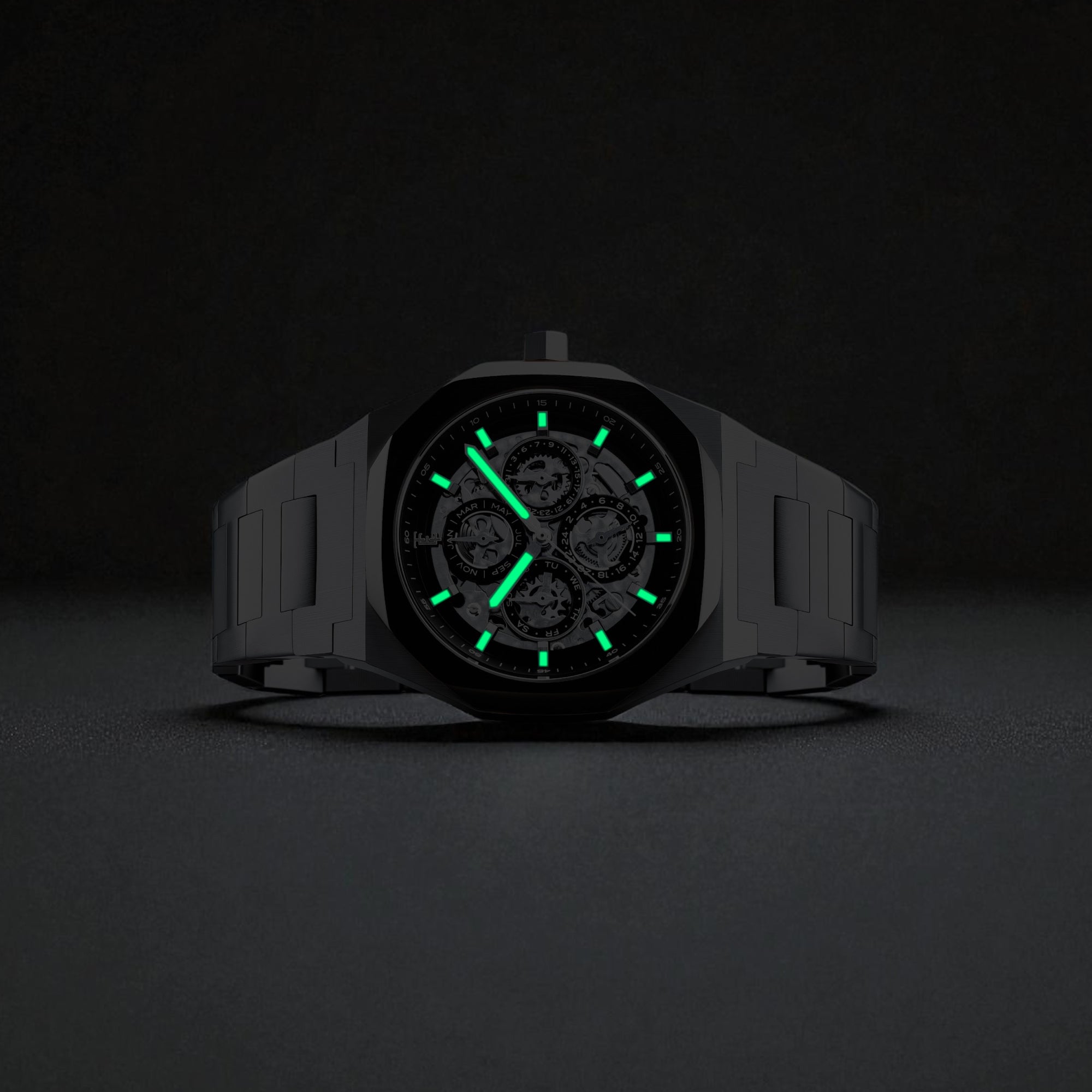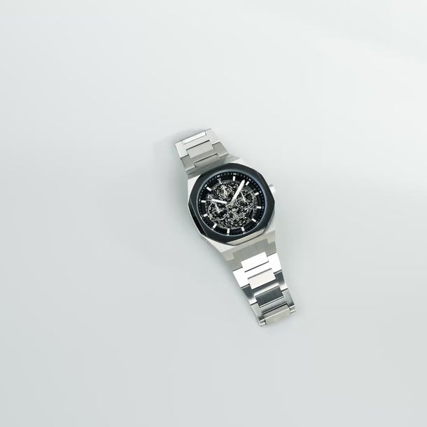 The Drake returns, now reimagined with enhanced complications. At its core, the automatic movement offers a clear display of time, day, date, and month—all at a glance. The skeletonized dial unveils the mechanical artistry within, showcasing the captivating rhythm of its inner workings. Encased in a 42mm polished stainless steel case, the Drake is designed to complement your journeys ahead.