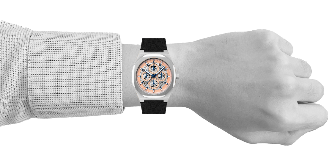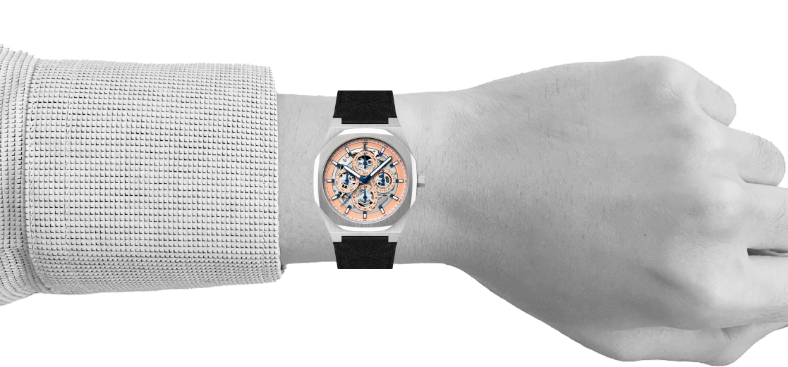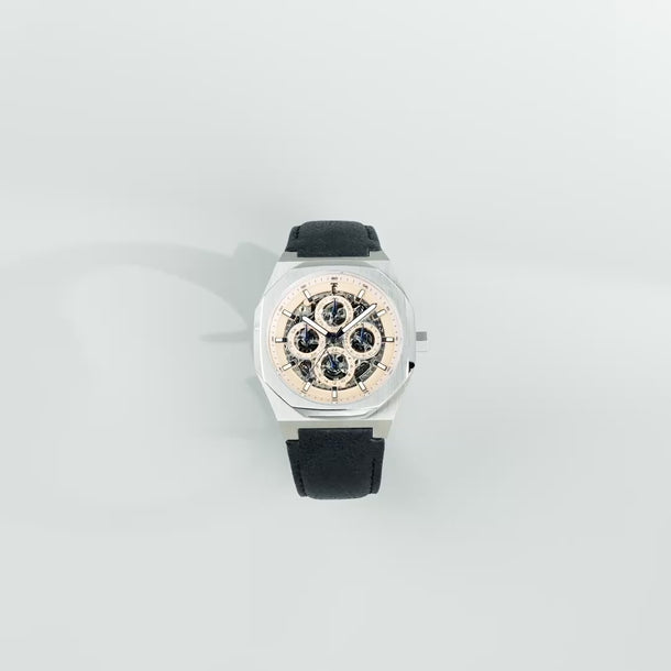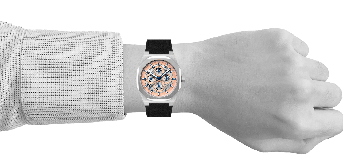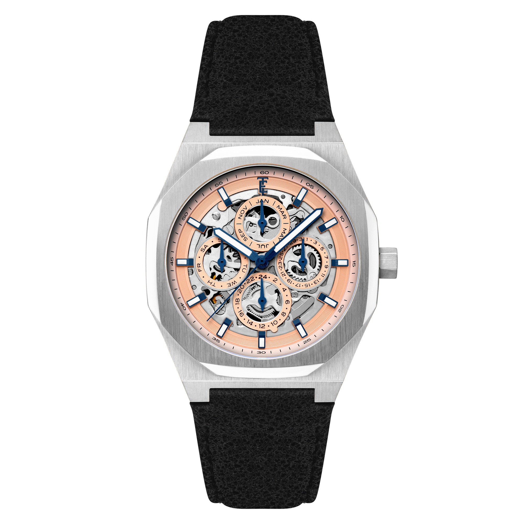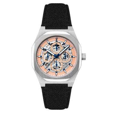 The Drake returns, now reimagined with enhanced complications. At its core, the automatic movement offers a clear display of time, day, date, and month—all at a glance. The skeletonized dial unveils the mechanical artistry within, showcasing the captivating rhythm of its inner workings. Encased in a 42mm polished stainless steel case, the Drake is designed to complement your journeys ahead.