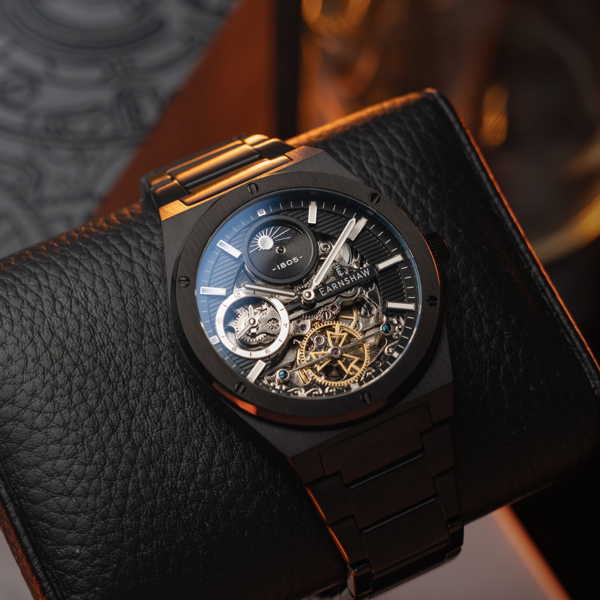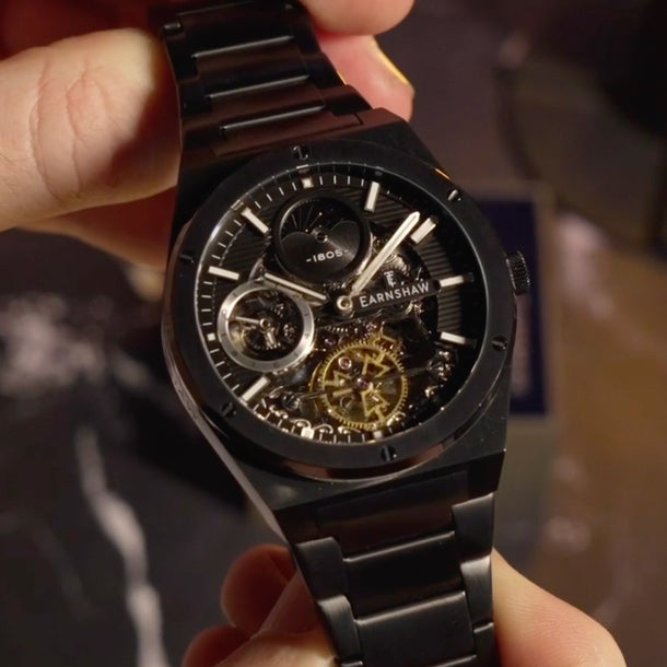 Introducing the new iteration of Drake, the collection that defines style and luxury. This timepiece exudes a clean and sporty look with its geometric case design. Its automatic movement boasts a dual time function, and the skeletonized dial adds both functional details and a touch of elegance. Experience the true expression of Earnshaw legacy with this modern and refined timepiece.