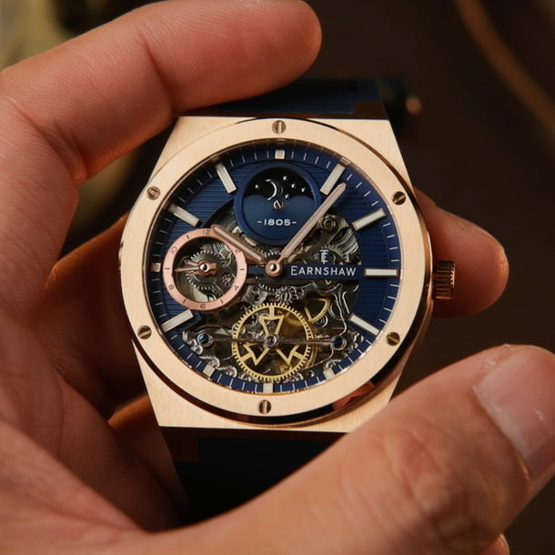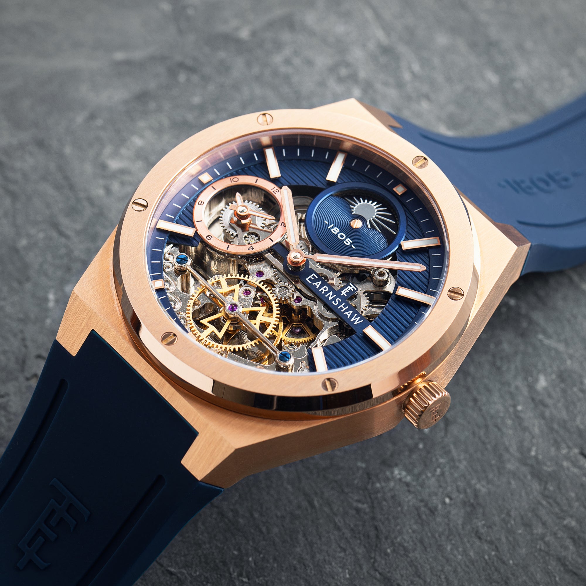 Introducing the new iteration of Drake, the collection that defines style and luxury. This timepiece exudes a clean and sporty look with its geometric case design. Its automatic movement boasts a dual time function, and the skeletonized dial adds both functional details and a touch of elegance. Experience the true expression of Earnshaw legacy with this modern and refined timepiece.