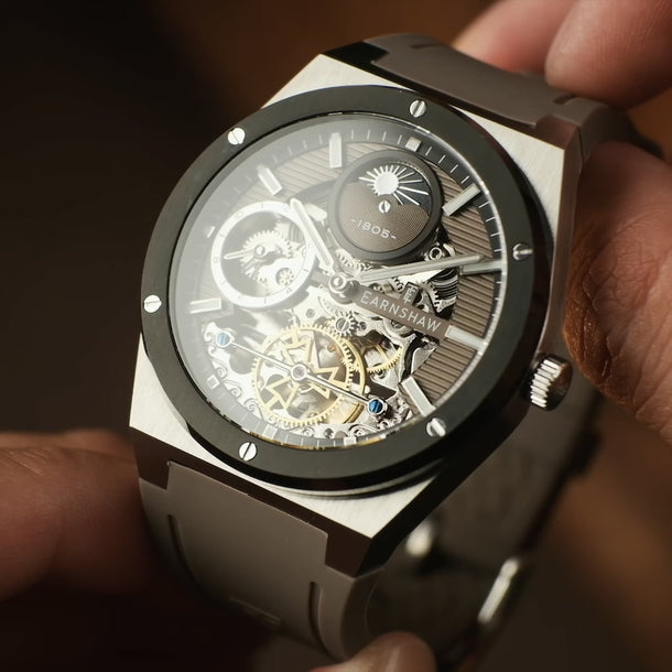 Introducing the new iteration of Drake, the collection that defines style and luxury. This timepiece exudes a clean and sporty look with its geometric case design. Its automatic movement boasts a dual time function, and the skeletonized dial adds both functional details and a touch of elegance. Experience the true expression of Earnshaw legacy with this modern and refined timepiece.