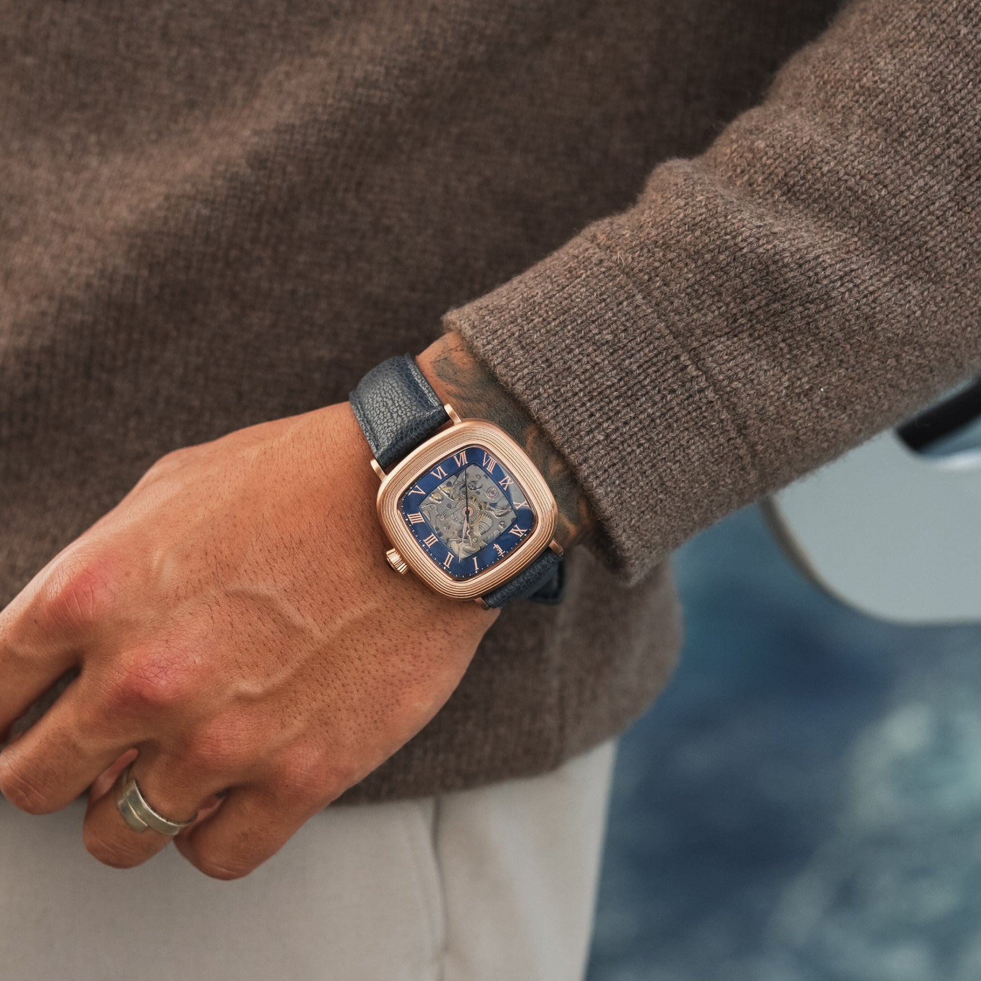With its compact 38mm square case, the Chester is designed for balance. The timepiece also reveals its mechanical heartbeat with its skeleton dial and see-through exhibition caseback. Effortlessly refined for both everyday wear and formal elegance, the Chester brings sophistication and character together in one clean, square form.