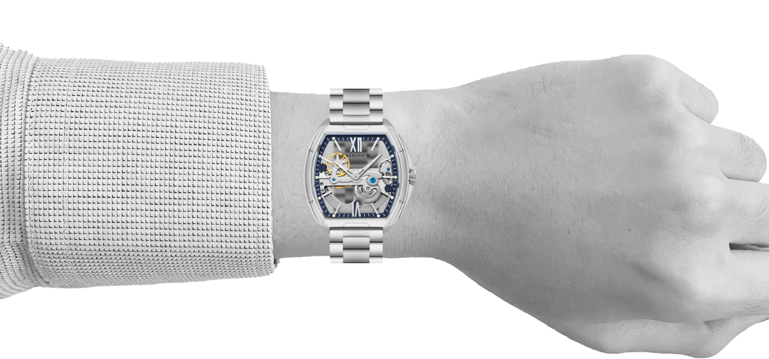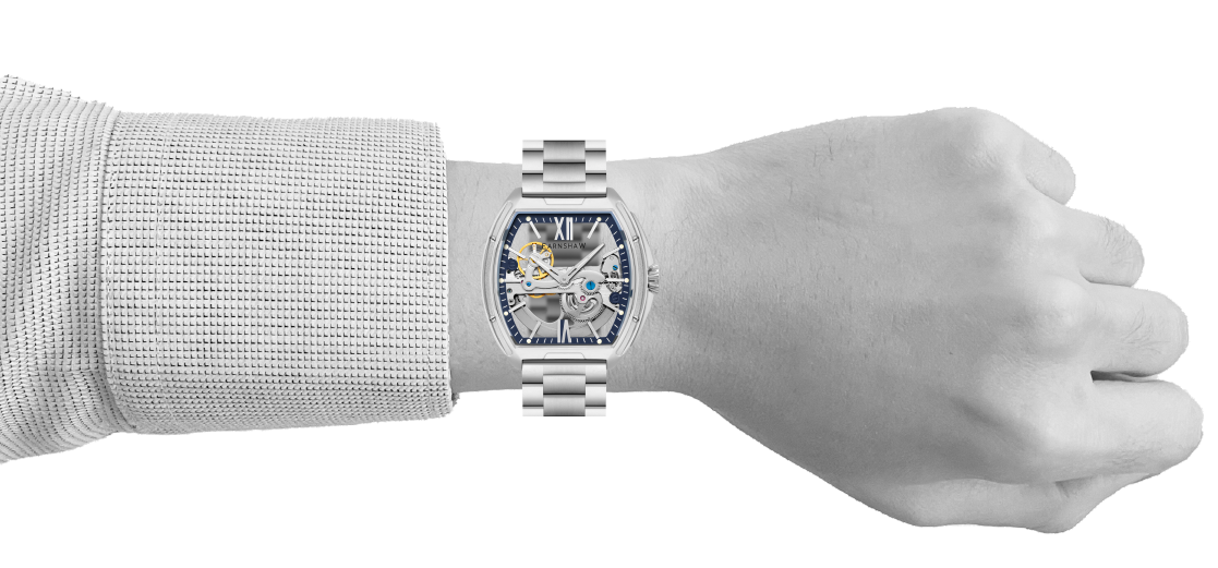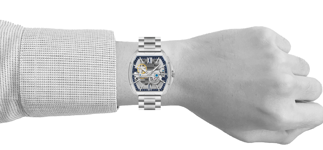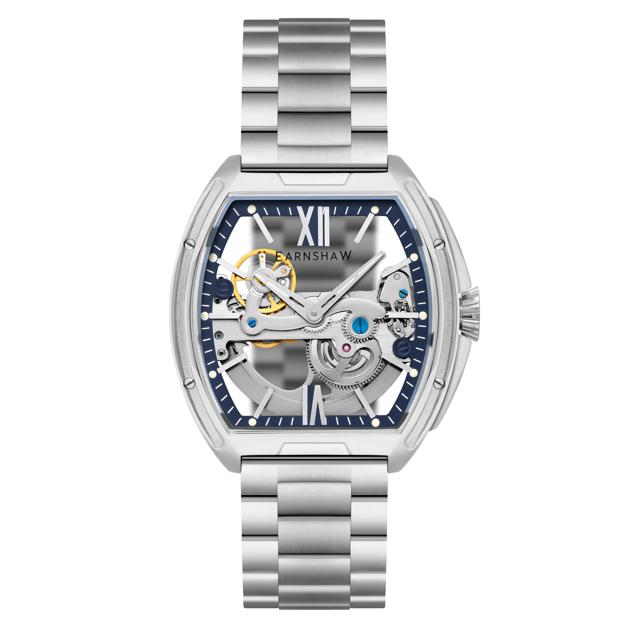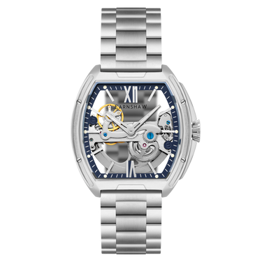 Sleek and striking, the Knightsbridge Automatic embraces openwork design with a fully transparent dial and exposed movement. Housed in a 45mm barrel-shaped case, this spectacular timepiece features Roman numeral accents and a double-curved lens. Pairing traditional elegance with contemporary flair, it redefines classic watchmaking.