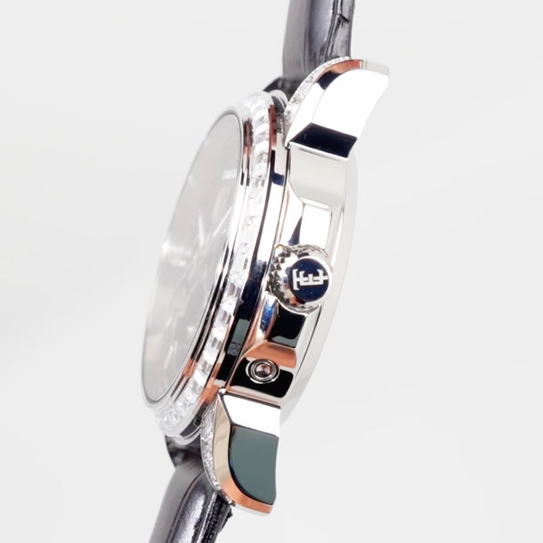 Designed for the modern connoisseur, this 43mm timepiece commands attention with a radiant bezel set with 38 Czech stones, framing a vivid dial enriched by displays for day, date, and month.