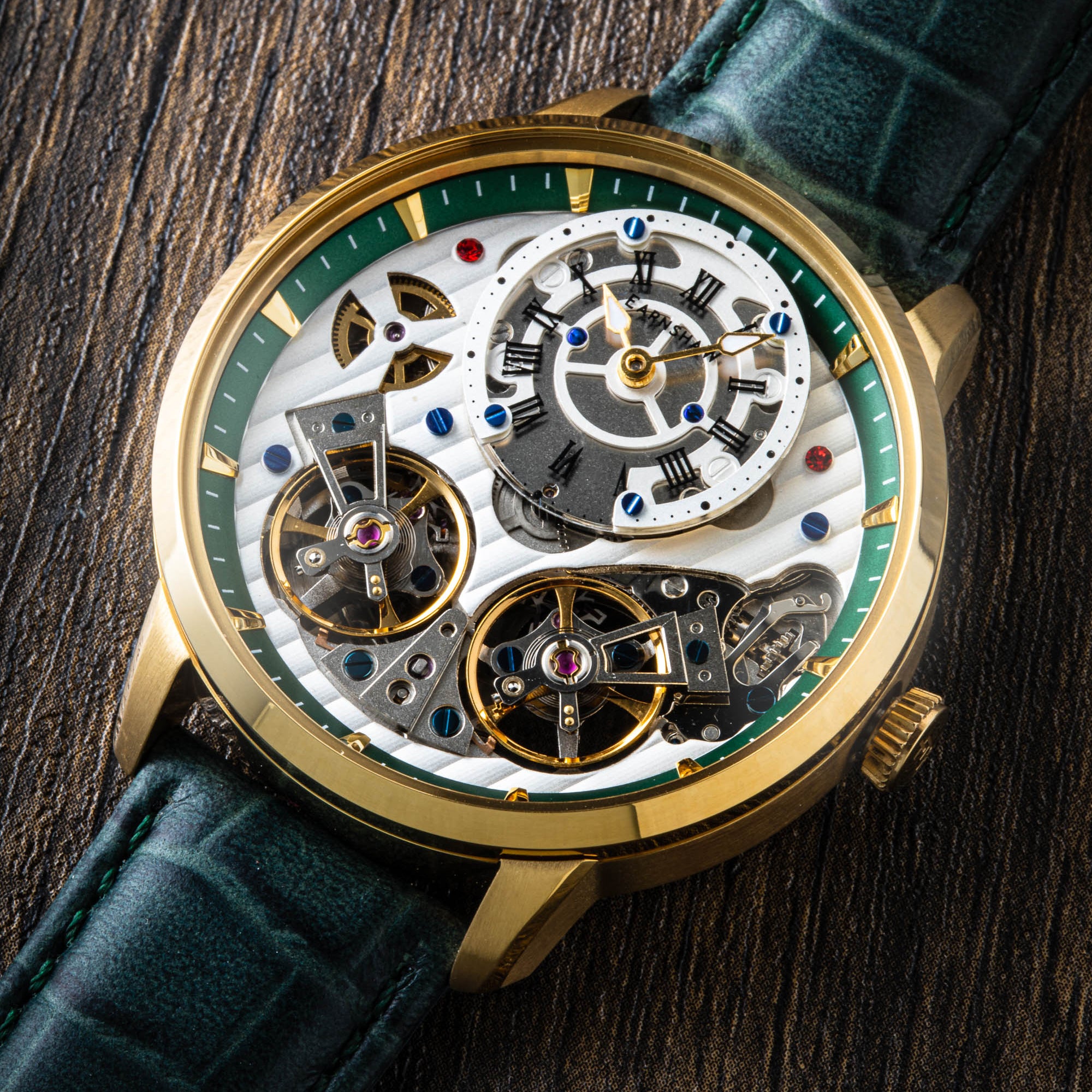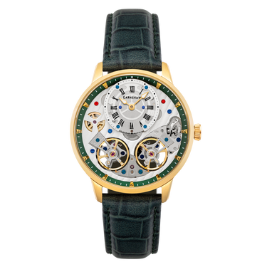 Quality, style and elaborated intricacy of truly skillful watchmaking. A double barrel automatic movement is fully on display framing the style and beauty of the watch. A watch of character, style charm and absolute horological elegance.